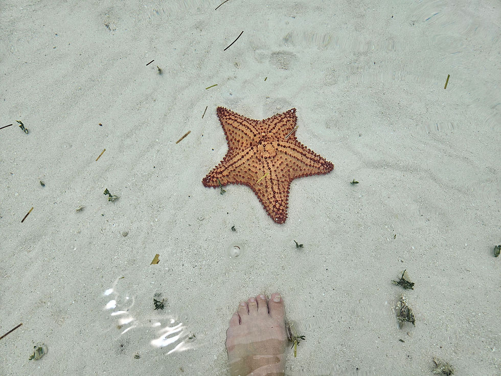 Als wir schon dachten, es würde zu regnen beginnen, legte das Boot zu einer winzigen kleinen Insel ab. Dort entdeckten wir riesige Seesterne und wir konnten viele Fotos machen.